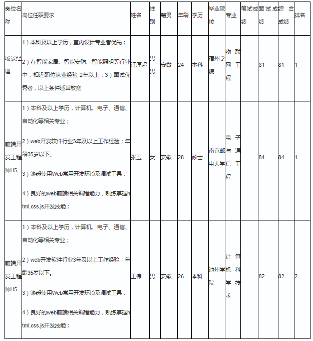 根據(jù)四川虹美智能科技有限公司發(fā)布的招聘公告及招聘相關(guān)規(guī)定,經(jīng)筆試、面試等程序,現(xiàn)將筆試(面試)成績(jī)予以公示。