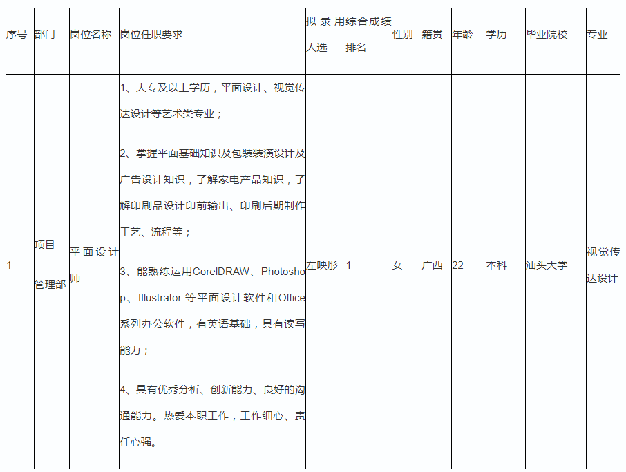 根據(jù)廣東長虹電子有限公司發(fā)布的招聘公告及招聘相關(guān)規(guī)定,經(jīng)面試、考察、體檢等程序,擬錄用左映彤同志到項(xiàng)目管理部工作,現(xiàn)予以公示,具體情況如下: