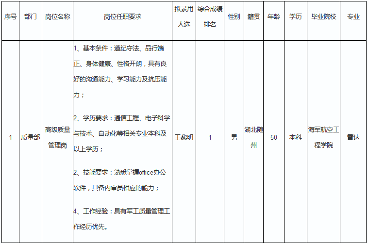 根據(jù)成都九洲迪飛科技有限責任公司發(fā)布的招聘公告及招聘相關(guān)規(guī)定,經(jīng)筆試、面試、考察、體檢等程序,擬錄用王黎明同志到成都九洲迪飛科技有限責任公司工作,現(xiàn)予以公示,具體情況如下: