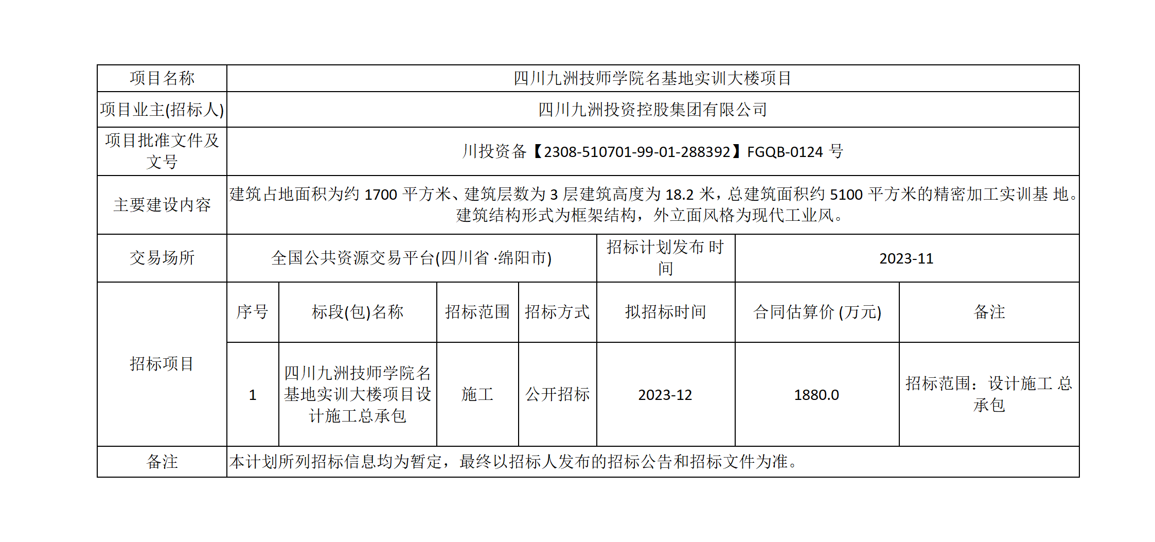 四川九洲技師學(xué)院名基地實(shí)訓(xùn)大樓項(xiàng)目項(xiàng)目招標(biāo)計(jì)劃表