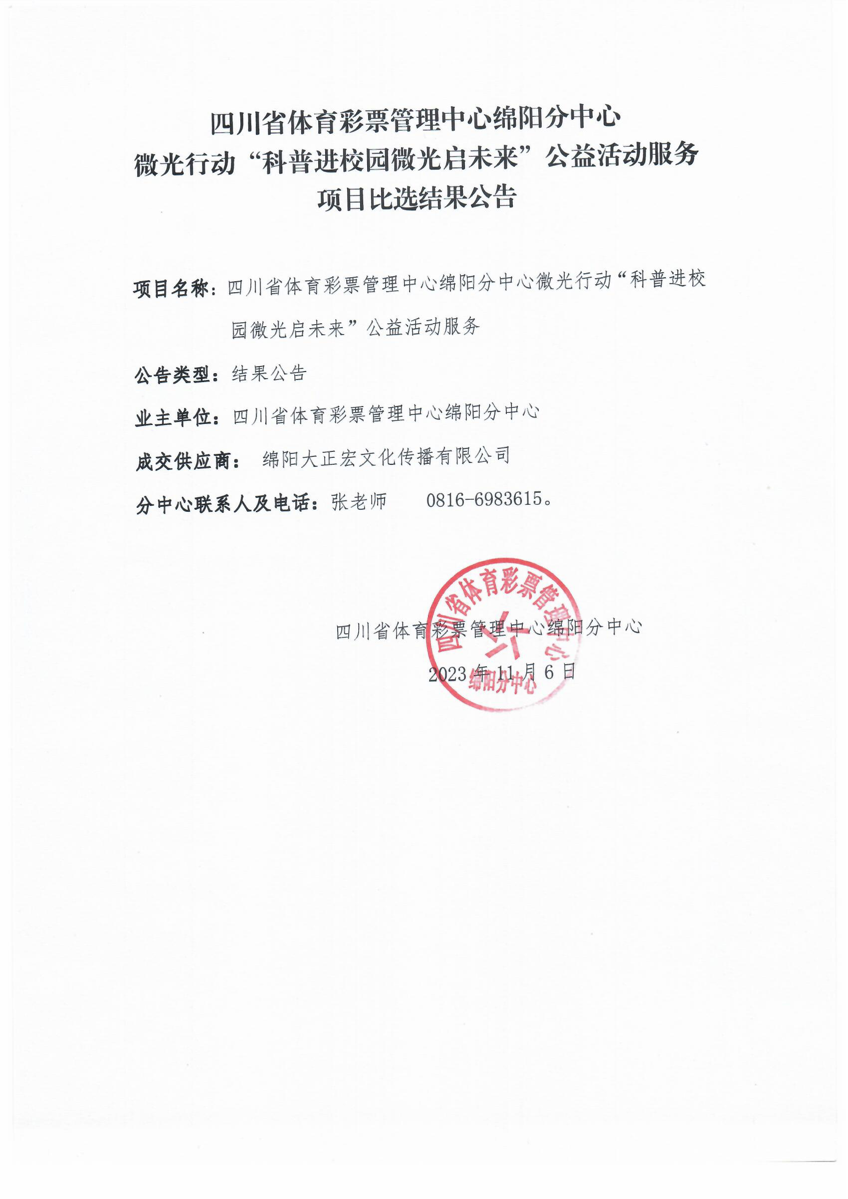 四川省體育彩票管理中心綿陽分中心微光行動“科普進校園微光啟未來”公益活動服務項目比選結(jié)果公告