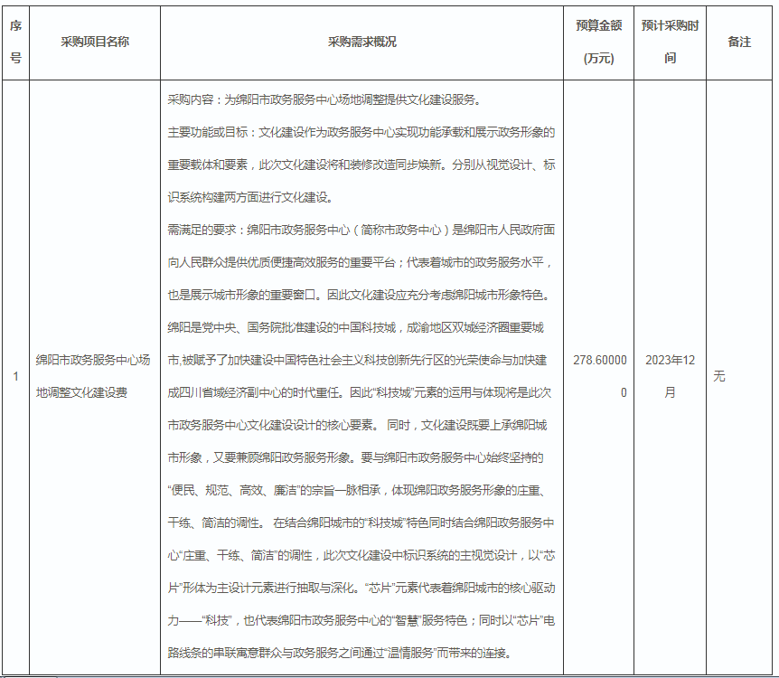 為便于供應(yīng)商及時了解政府采購信息,根據(jù)《四川省財(cái)政廳關(guān)于開展政府采購意向公開工作的通知》(川財(cái)采〔2021〕153號)要求,現(xiàn)將綿陽市政務(wù)服務(wù)監(jiān)督管理局2023年度(第8批)采購意向公開如下: