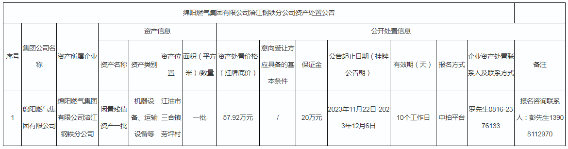 綿陽燃?xì)饧瘓F(tuán)有限公司涪江鋼鐵分公司資產(chǎn)處置公告