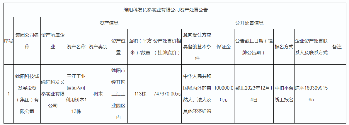 綿陽(yáng)科發(fā)長(zhǎng)泰實(shí)業(yè)有限公司資產(chǎn)處置公告