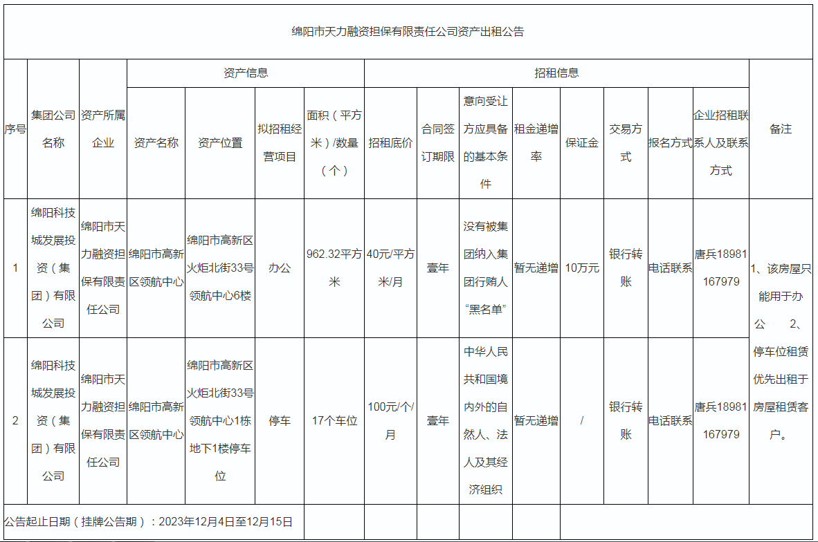 綿陽(yáng)市天力融資擔(dān)保有限責(zé)任公司資產(chǎn)出租公告