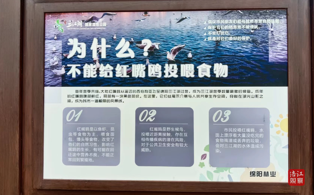 在離觀鷗點不遠處,三江湖國家濕地公園立有一塊公告牌,倡議市民“不能給紅嘴鷗投喂食物”,并闡明投喂的三個弊端——
