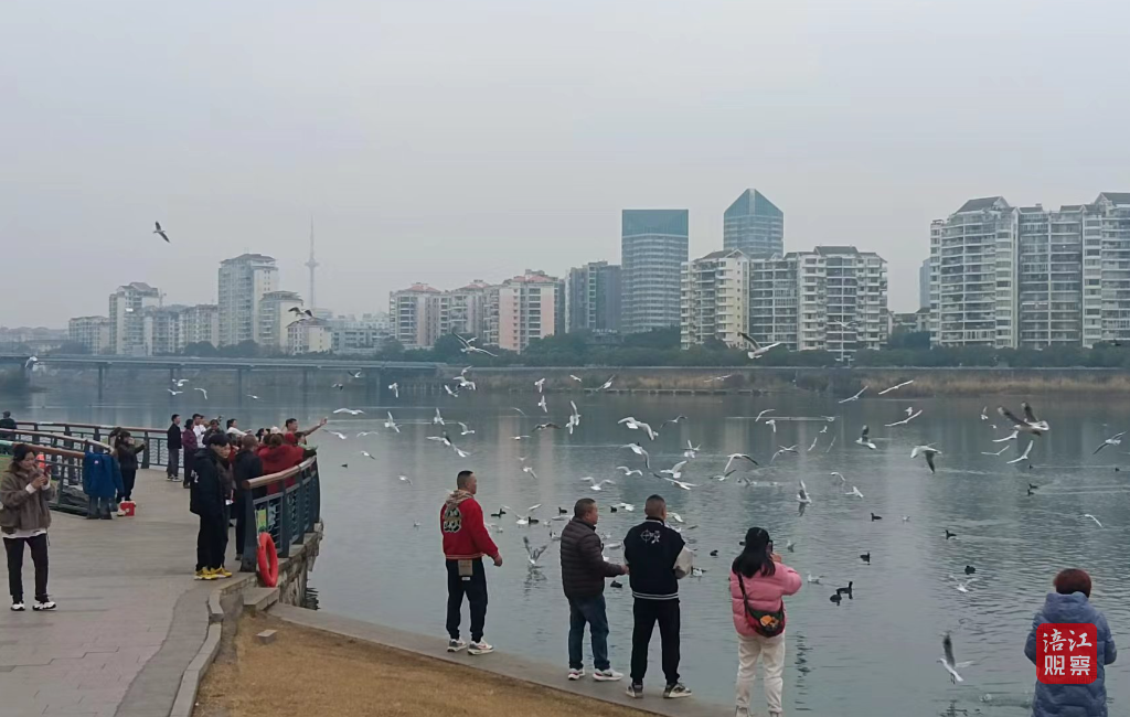 “投喂紅嘴鷗,面包5元一包,請掃碼付款。”在三江半島的一個攤點前,一個高音喇叭反復(fù)播放著廣告,一旁的地面則散落著一些面包屑。周圍投喂紅嘴鷗的市民熱情不減,一邊投喂,一邊拍照“打卡”。面包屑在江面四處漂浮,與人鷗共舞的美景形成強烈的反差。這是記者12月5日上午在三江半島見到的一幕。