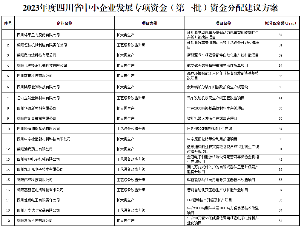 根據(jù)市經(jīng)信局《關(guān)于做好2023年度四川省中小企業(yè)發(fā)展專項(xiàng)資金(第一批)申報(bào)工作的通知》(綿經(jīng)信企業(yè)〔2023〕578號(hào))要求,通過企業(yè)自主申報(bào),縣(市、區(qū))、園區(qū)工業(yè)經(jīng)濟(jì)主管部門初審?fù)扑],經(jīng)相關(guān)科室審核、專家評(píng)審、現(xiàn)場核查和市經(jīng)信局黨組會(huì)審議等程序?,F(xiàn)對(duì)擬支持的19家企業(yè)(項(xiàng)目)名單予以公示。