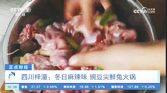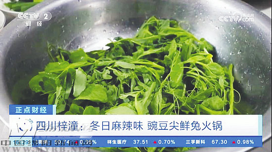 12月15日,央視CCTV2《正點財經(jīng)》將鏡頭再次對準綿陽梓潼冬日麻辣鮮香美食—豌豆尖鮮兔火鍋。報道稱,每到冬天的時候,梓潼縣的村民就喜歡將兔肉與當季豌豆尖組合,做上一鍋麻辣鮮香的豌豆尖鮮兔火鍋,驅(qū)寒暖身。
