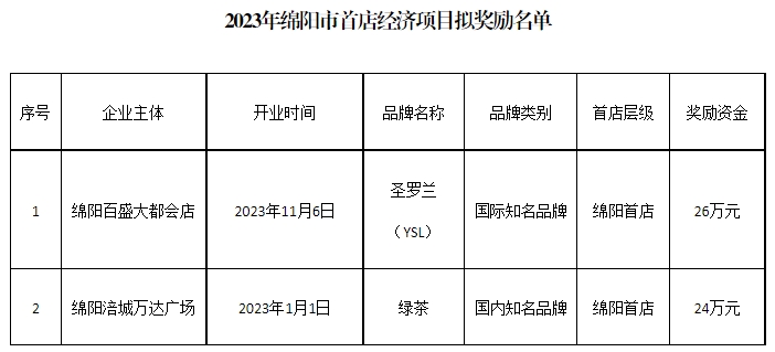 附件:2023年綿陽市首店經(jīng)濟(jì)項(xiàng)目擬獎(jiǎng)勵(lì)名單