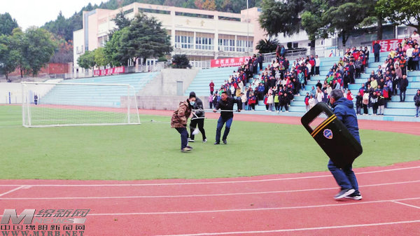 演練環(huán)節(jié)驚心動(dòng)魄,“恐怖分子”拿著兇器闖入校園,襲擊師生(如圖),學(xué)校立即拉響應(yīng)急警報(bào),撥打報(bào)警電話(huà)。接到報(bào)警后,市公安局仙海分局沉抗派出所民警立刻趕到現(xiàn)場(chǎng),聯(lián)合學(xué)校保安制服“恐怖分子”。整個(gè)演練過(guò)程緊張有序,展示出學(xué)校應(yīng)對(duì)突發(fā)事件的快速處理能力。