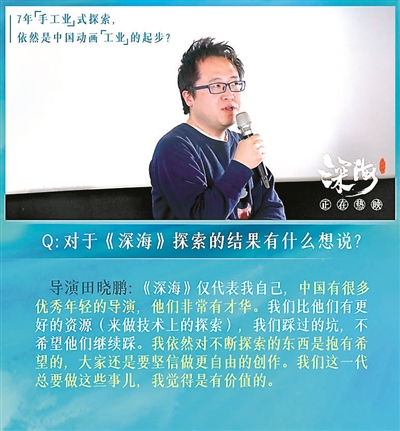 《大圣歸來》豆瓣8.3分,《深?!?.3分,一分之差,讓田曉鵬聽到了不少批評的聲音,對此田曉鵬坦承《深海》是他一次冒險,這是他一次非常個人化的創(chuàng)作,“我愿意承擔這次冒險的代價”。