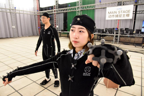 2月8日,青島東方影都影視產(chǎn)業(yè)園工作人員在演示動(dòng)作捕捉技術(shù)。