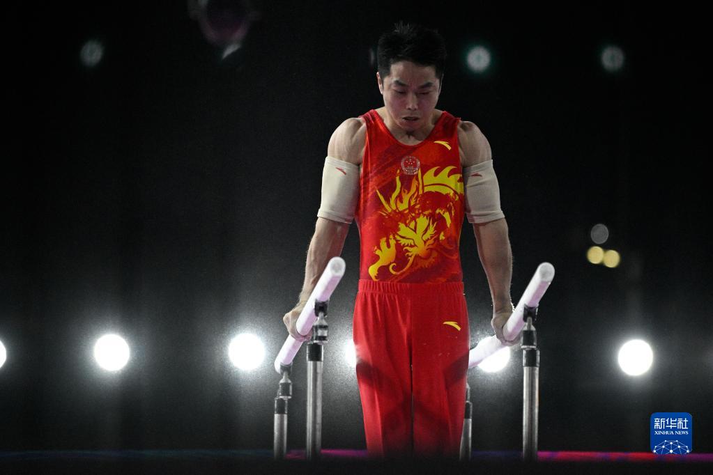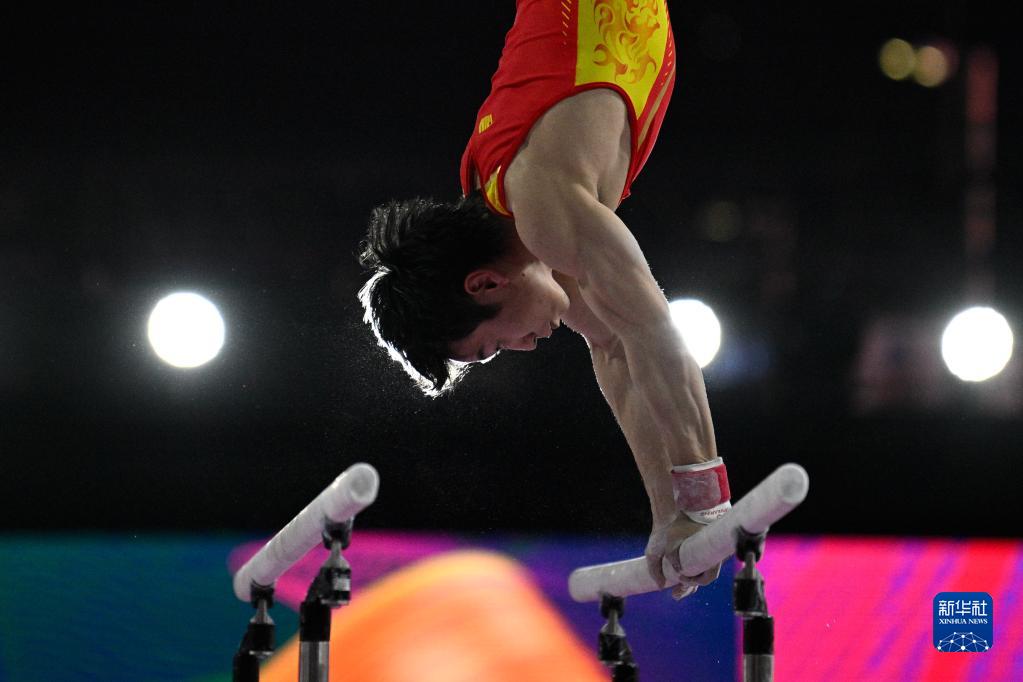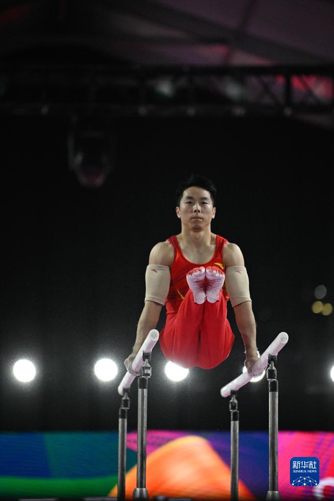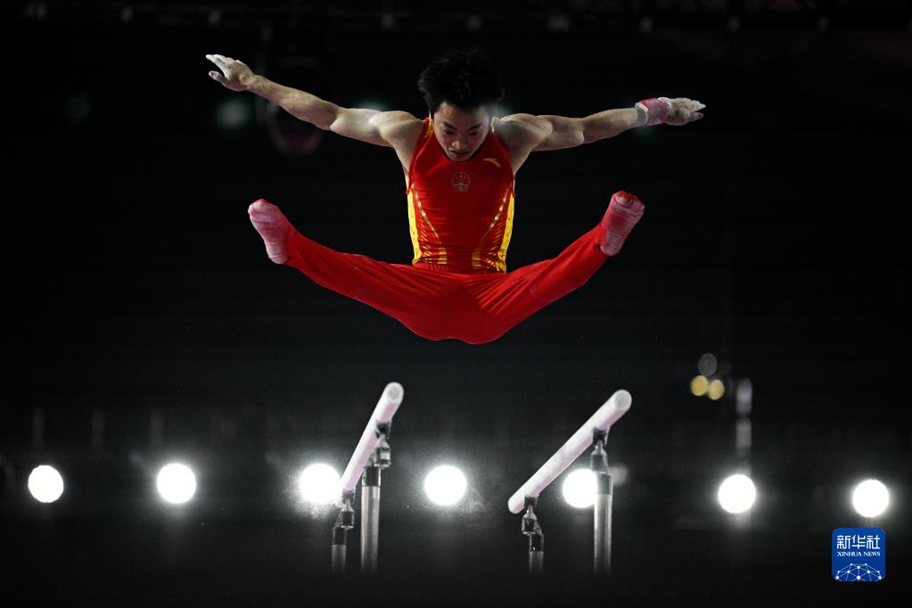 4月16日,四川隊(duì)選手鄒敬園在雙杠比賽中,最終他位列第一名。新華社記者 胥冰潔 攝