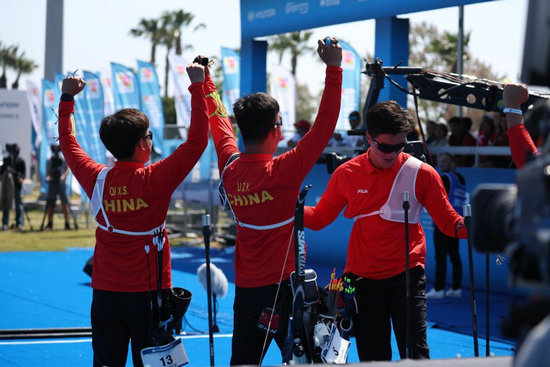 李中原、齊翔碩和魏紹軒組成的中國男隊當(dāng)日贏得極為驚險。首局中國隊以55:54微弱優(yōu)勢拿下,第二局中國隊以56:50輕松再下一城,大比分4:0領(lǐng)先。第三局兩隊都發(fā)揮出了高水平,印度隊六箭有五箭射中10環(huán),以59:58扳回一城。第四局中國隊在最后一箭命中9環(huán)即可奪冠的情況下,射中一個8環(huán),印度隊56:55再勝,將總比分扳成4:4。附加賽中兩隊均得到28環(huán)的成績,且均為兩個9環(huán)、一個10環(huán),憑借李中原射中的X(10環(huán)內(nèi)圈),中國隊5:4險勝對手奪冠。