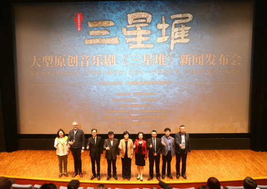由四川省委宣傳部、紫荊文化集團有限公司指導(dǎo),中國對外文化集團有限公司、四川省文化和旅游廳出品,北京天橋盛世投資集團有限責(zé)任公司聯(lián)合出品,中演演出院線發(fā)展有限責(zé)任公司、四川省歌舞劇院有限責(zé)任公司聯(lián)合主辦,北京四海一家文化傳播有限責(zé)任公司、四川省歌舞劇院有限責(zé)任公司聯(lián)合制作、三星堆博物館支持的大型原創(chuàng)音樂劇《三星堆》新聞發(fā)布會8日在中國國家博物館舉行。