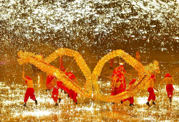 1500℃的鐵水被拍打成鐵水花兒,像漫天流星劃過天際,火雨紛紛,星落遍地……晚上8時許,焰火龍表演將活動推向了高潮,一條長龍在一個個赤膊舞龍人的手中翻騰著,構(gòu)成了一幅“人在火中舞,龍在火中飛”的壯美景致。在現(xiàn)場,歡呼聲、喝彩聲此起彼伏,大家不時拿出相機(jī),記錄下這難忘的瞬間。