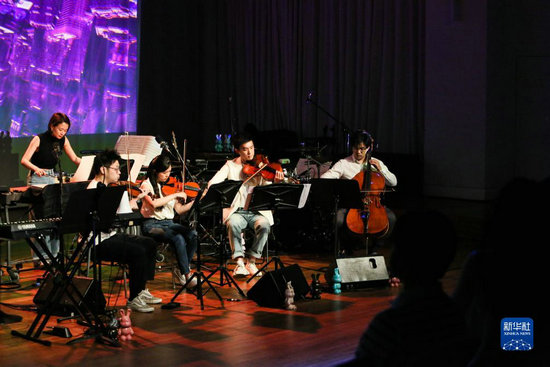 這是7月11日拍攝的音樂會現(xiàn)場。當(dāng)日,“極地游樂場——王斐南流行室內(nèi)樂融合劇場”在上海舉辦。作為2023上海夏季音樂節(jié)一系列演出之一,音樂家們?yōu)橛^眾演繹了一場多維融合的室內(nèi)樂作品音樂會。(新華社記者 辛夢晨 攝)