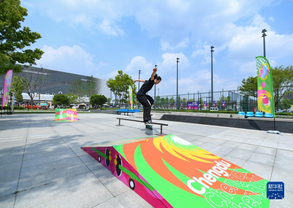 4月19日,滑板愛好者在成都東安湖體育公園練習滑板。