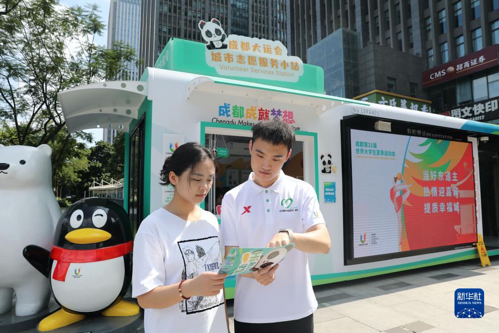 7月15日,在成都東部新區(qū)三岔湖的成都大運會城市志愿服務小站,志愿者為游客介紹當?shù)芈糜钨Y源。