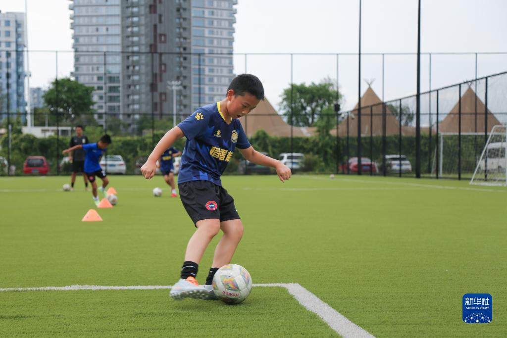7月21日,在四川天府新區(qū)CDT運動公園內(nèi),小朋友參加暑期少兒足球訓練。
