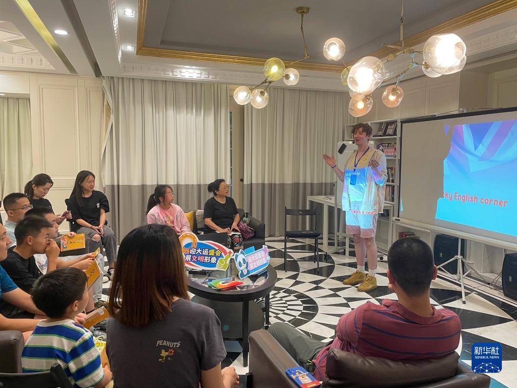 7月13日,丁小丁(右二)在成都桐梓林國際社區(qū)鄰里中心書院的英文課堂上。