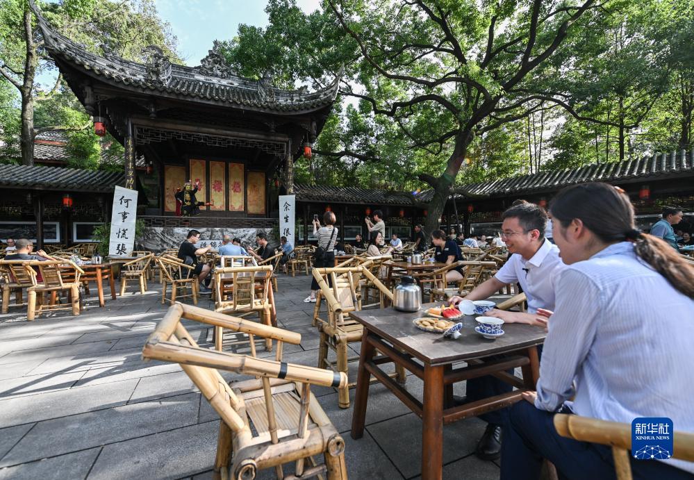 7月14日,在成都高新區(qū)鐵像寺水街,游客在茶鋪體驗當?shù)靥厣w碗茶。