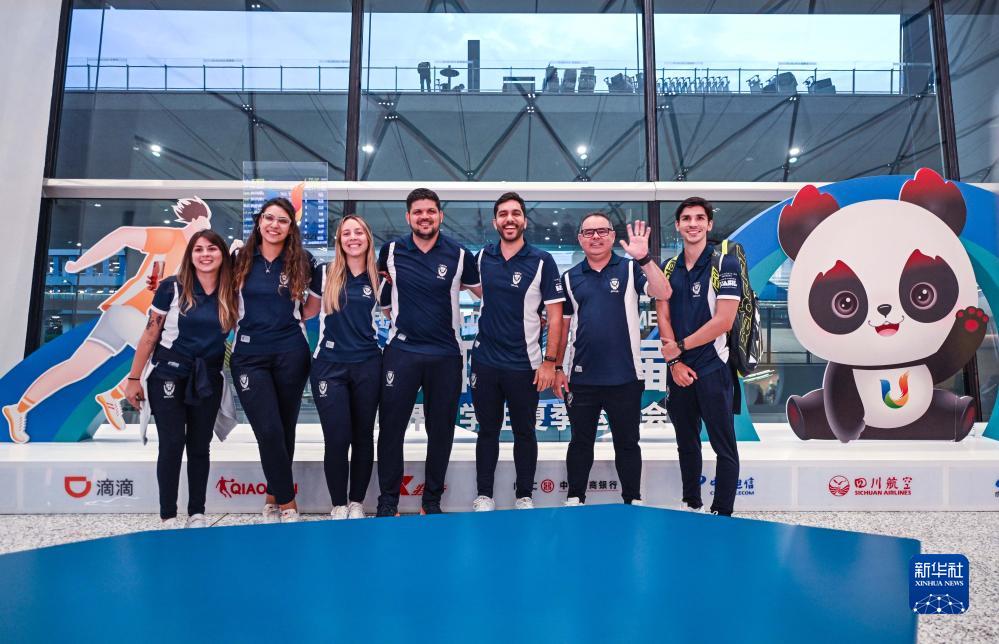 7月17日,首批抵蓉的巴西代表團成員在成都天府國際機場合影留念。