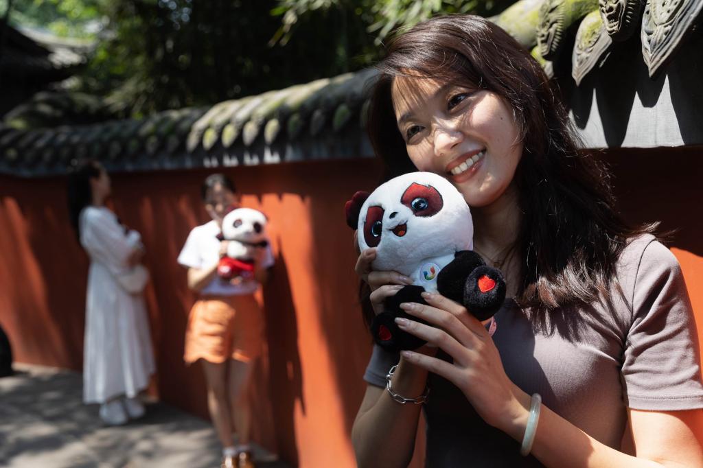 7月19日,游客手捧成都大運(yùn)會(huì)吉祥物“蓉寶”在杜甫草堂的紅墻邊留影。新華社記者 江宏景 攝