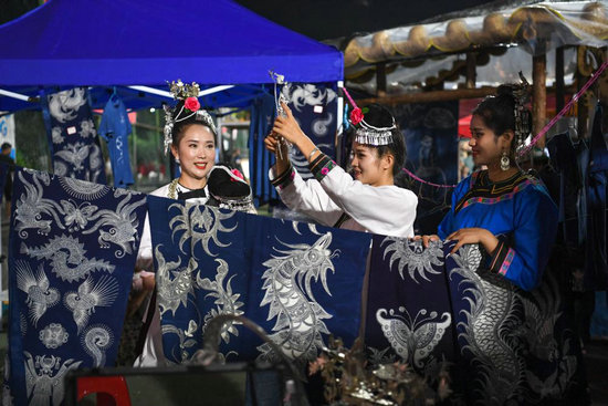 在臺盤村融媒工坊非遺線下體驗店,一款集合苗繡和銀飾的文創(chuàng)壁畫“全家福”工藝品深受游客喜愛。“這個蝴蝶是我們苗族的圖騰,這個銀飾中間就是福,這兩邊是兩條魚,代表魚跳龍門,上面就是家和萬事興。”臺江縣苗族銀飾鍛造傳承人張志林說,“我們結(jié)合直播帶貨,這幾天銷售量接近2000幅。”