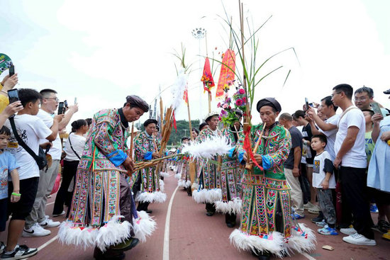 6月23日,村民自發(fā)組成的民族歌舞表演隊盛裝吹蘆笙入場。新華社發(fā)(王炳真攝)