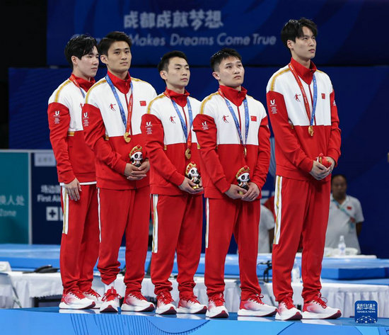 當(dāng)日,在成都舉行的第31屆世界大學(xué)生夏季運(yùn)動(dòng)會(huì)體操項(xiàng)目男子團(tuán)體決賽中,中國(guó)隊(duì)以262.594分的總成績(jī)獲得冠軍。