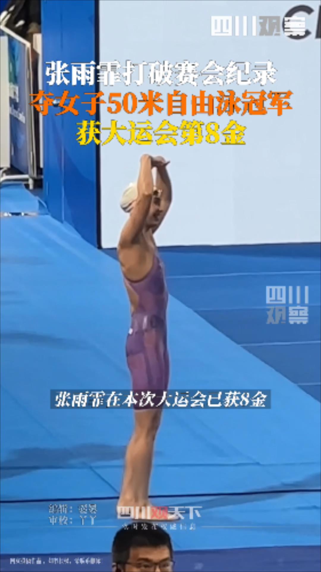 8月7日,成都大運(yùn)會(huì)女子50米自由泳項(xiàng)目決賽在東安湖體育公園游泳跳水館舉行,中國(guó)隊(duì)員張雨霏以24.29秒的成績(jī)奪得金牌,并打破世界大學(xué)生運(yùn)動(dòng)會(huì)該項(xiàng)目的紀(jì)錄,這也是張雨霏在本屆大運(yùn)會(huì)的第8金。
