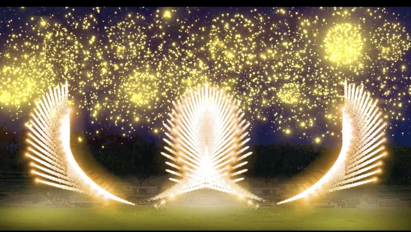 開幕式上,火炬手點(diǎn)燃的大運(yùn)會(huì)火炬騰飛到空中,幻化成太陽神鳥金飾的十二道金芒后,一路奔向主火炬臺(tái),點(diǎn)燃熊熊火光。閉幕式承接著開幕式的創(chuàng)意,以焰火為串聯(lián),將地域特色與和平愿景結(jié)合。