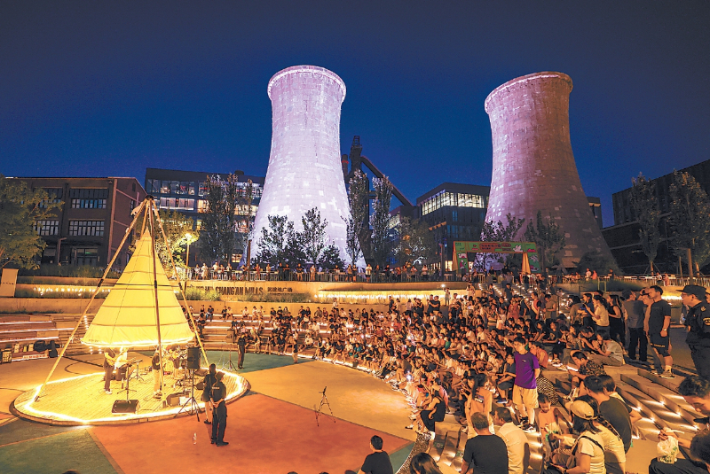 8月13日晚,在首鋼園六工匯沉淀池廣場(chǎng),音樂愛好者在彈唱,市民圍坐欣賞。 本報(bào)記者 鄧偉攝