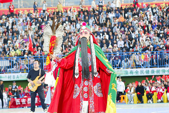 在比賽開幕式現(xiàn)場,當?shù)靥厣沁z“春官送福”節(jié)目表演。