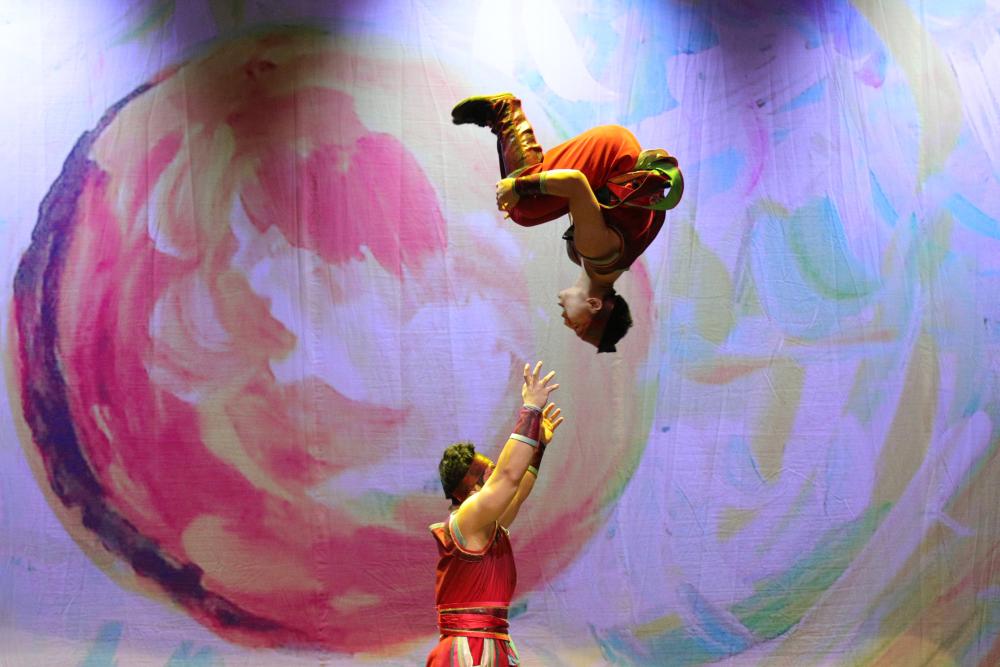 9月3日,湖南省雜技藝術(shù)劇院的演員在西班牙馬德里EDP格蘭維亞劇院演出。新華社記者 孟鼎博 攝