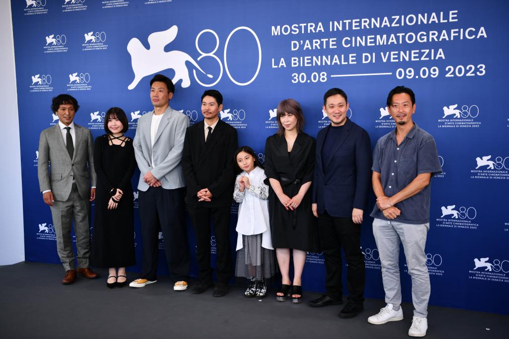 9月4日,電影《邪惡不存在》導(dǎo)演濱口龍介(右二)攜主創(chuàng)人員出席意大利威尼斯電影節(jié)拍照式。新華社記者 金馬夢妮 攝
