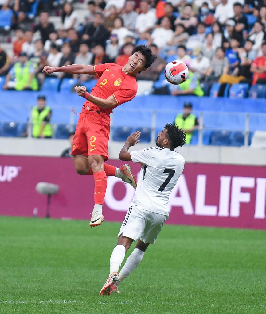 9月6日,中國隊(duì)球員胡荷韜(左)在比賽中爭頂。新華社記者 龍雷 攝