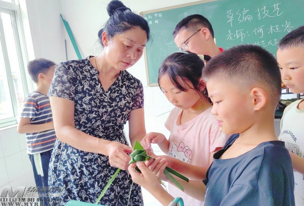 草編技藝教授環(huán)節(jié),更是引人入勝。“拇指和食指捏住粽葉不要松,另一只手將粽葉的另一端穿過來,再繞過去……”在何桂容手把手的示范下,同學(xué)們紛紛拿起課桌上的粽葉,有模有樣地做起來……“我的編好了,我的編好了”,不一會兒,同學(xué)們爭先恐后舉起手中的“小花”、“蝴蝶”向大家展示。