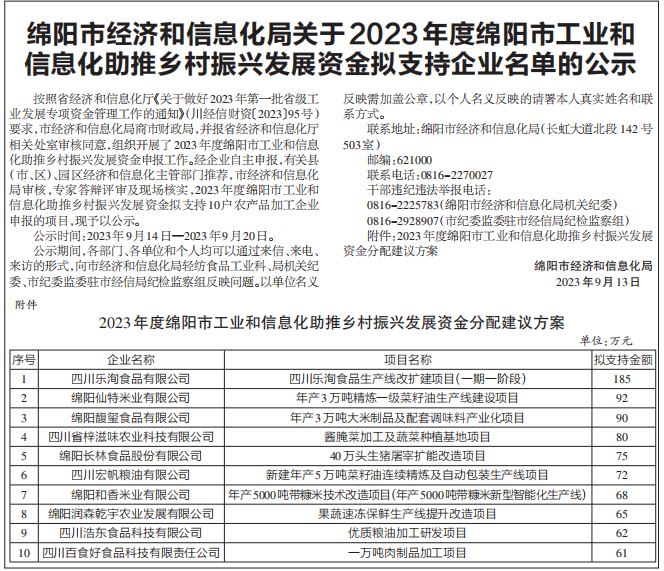 綿陽市經(jīng)濟(jì)和信息化局關(guān)于2023年度綿陽市工業(yè)和信息化助推鄉(xiāng)村振興發(fā)展資金擬支持企業(yè)名單的公示