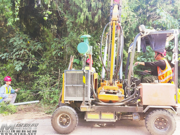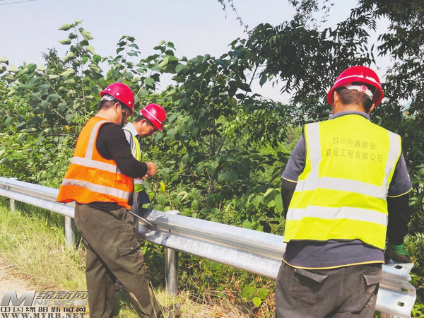 在小枧鎮(zhèn)玉龍村,工人們正在安裝公路防護(hù)欄