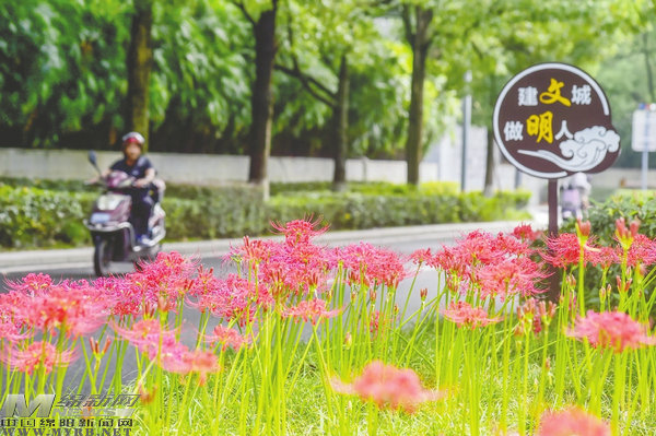 最近,經(jīng)開區(qū)涪濱路上的一片片彼岸花迎來盛開期,翠綠纖細的稈莖上,一朵朵鮮紅艷麗的花隨風(fēng)舞動,張揚又熱烈。