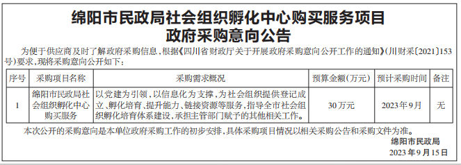 綿陽市民政局社會組織孵化中心購買服務(wù)項目政府采購意向公告