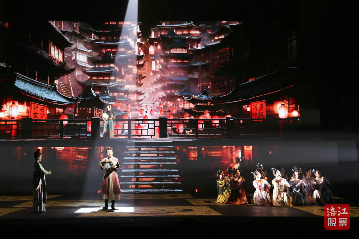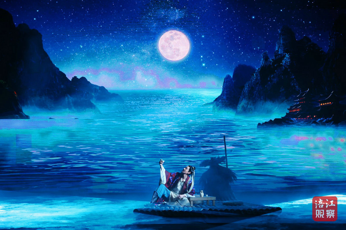 當(dāng)天19時30分,李白的人生故事隨著音樂聲啟幕。在四川綿陽的江油青蓮鎮(zhèn),李白在家鄉(xiāng)的自然山水間盡情釋放才情,恣意表達(dá)自己放蕩不羈的生活方式。在親人和朋友的支持、鼓勵下,他為國辭鄉(xiāng)出蜀,最終成為一代“詩仙”。