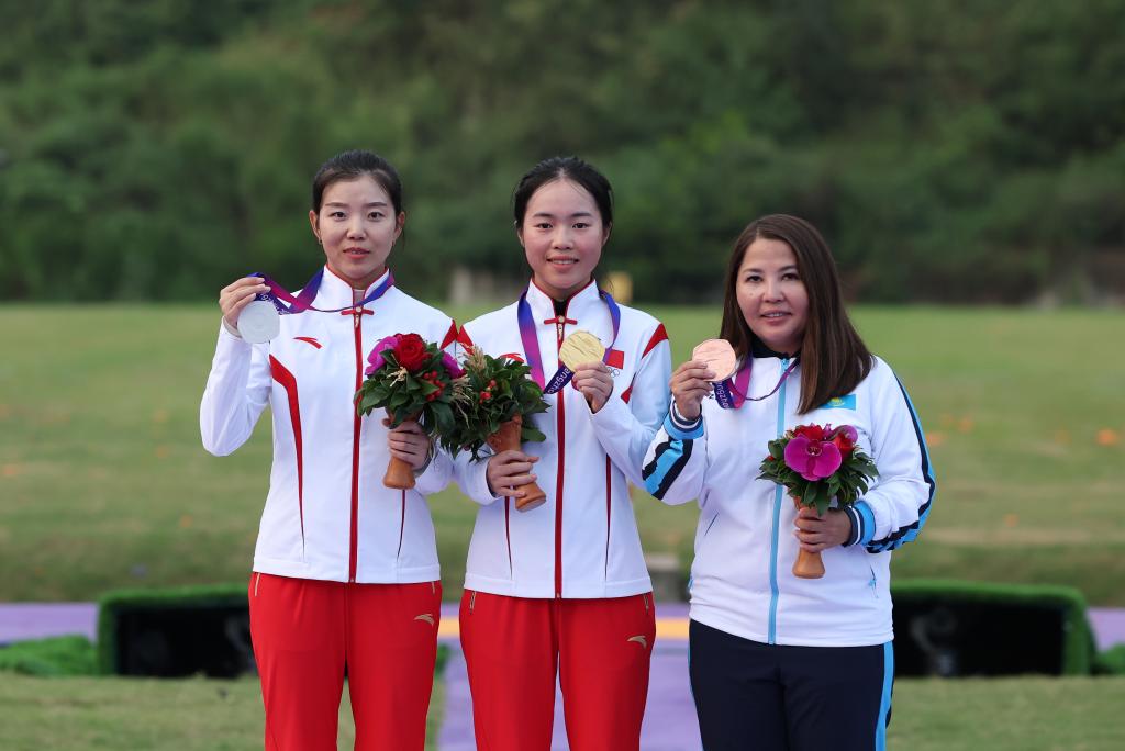9月27日,冠軍中國選手江伊婷(中)、亞軍中國選手高金梅(左)和季軍哈薩克斯坦選手阿謝姆·奧倫拜在頒獎儀式上。新華社記者 杜瀟逸 攝