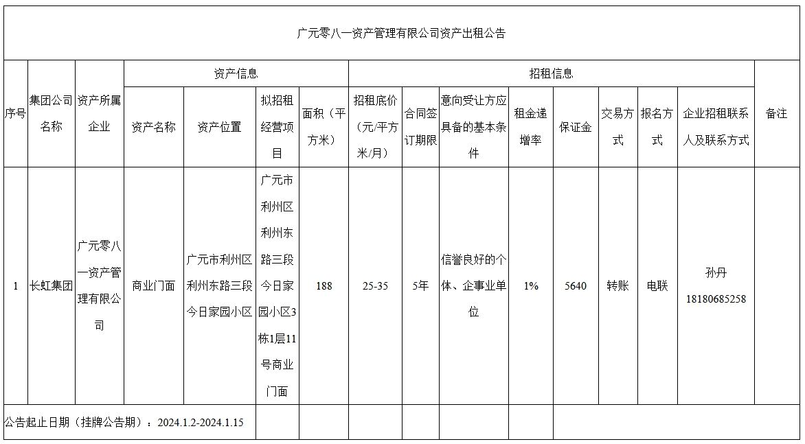 廣元零八一資產(chǎn)管理有限公司資產(chǎn)出租公告