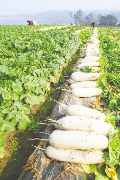 目前,在潼川鎮(zhèn)像代崇江這樣的蘿卜種植大戶共有3戶,白蘿卜種植面積已逾千畝。隨著產(chǎn)量的增加、品質(zhì)的提升,潼川鎮(zhèn)種植的白蘿卜在享譽(yù)周邊市場(chǎng)的同時(shí),也逐漸端上重慶、北京、廣州等地的餐桌。