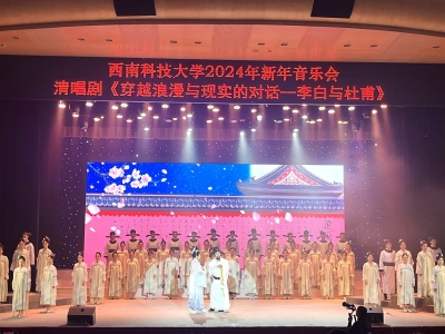 作為校地共建“中華優(yōu)秀傳統(tǒng)文化傳承基地”項目、省級扶持項目清唱劇《穿越浪漫與現(xiàn)實的對話——李白與杜甫》,由西南科技大學文學與藝術學院、綿陽市文化館合力打造。以李白、杜甫二人的多次交會和人生中幾次重要轉折點為線索,以藝術的形式呈現(xiàn)二人的風雨人生和思索及他們心系天下與國家的赤誠情懷,啟發(fā)今人只要秉持崇高的人生理想,堅定心系民族與國家的蓬勃信念,深深融入到為人民、為國家、為民族而奮斗的火熱事業(yè)中,人生就能綻放出無限光彩。
