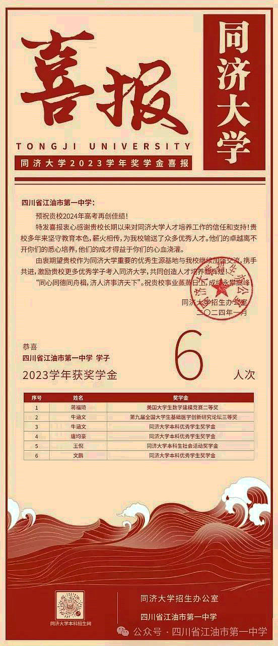 同濟(jì)大學(xué)的喜報(bào)是對(duì)江油一中長期以來培養(yǎng)優(yōu)秀拔尖人才所作貢獻(xiàn)的最好印證。江油一中一直秉持“特色發(fā)展、多元發(fā)展、全面發(fā)展”的理念,堅(jiān)守教育初心,傳承薪火,不斷為國家輸送優(yōu)秀學(xué)子。蔣福琦等5名同學(xué)的優(yōu)異表現(xiàn)得到了同濟(jì)大學(xué)的充分肯定。